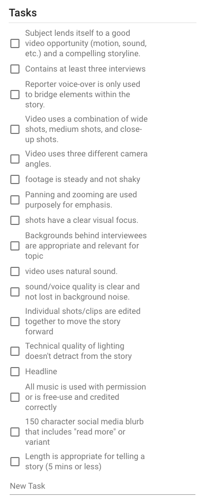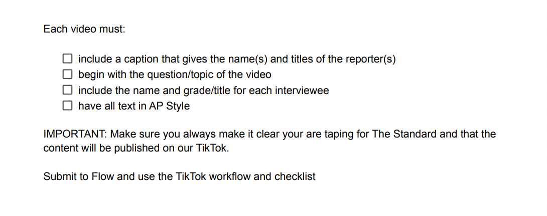Because visual storytelling is such a different realm than writing, I added respective checklists to our Flow program to help guide reporters in creating videos. This checklist ensures that video and podcast expectations are crystal clear and reporters feel supported in pursuing broadcast journalism ideas: