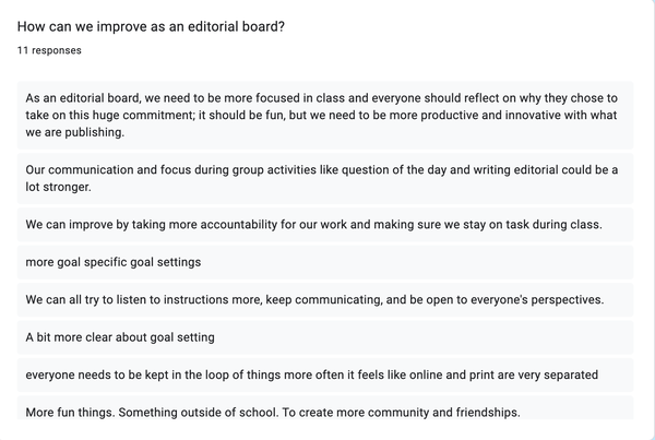 The value of mentorship cannot be understated. To create this sense of mentorship in the editors class, I've encouraged my editors to present mini-lessons to the class. This year, we've had presentations on types of leadership, opinion writing and open-ended questions. Section editors and leads often catch errors that never make it to the managing team. Thus, by teaching the class about the ins and outs of supporting claims or correct image attribution, these errors are mitigated and others feel empowered to learn and grow both journalistically and as leaders. These also serve as a powerful way to remind editors that we all have something to learn from each other. Below are a few examples of mini-lessons presented: