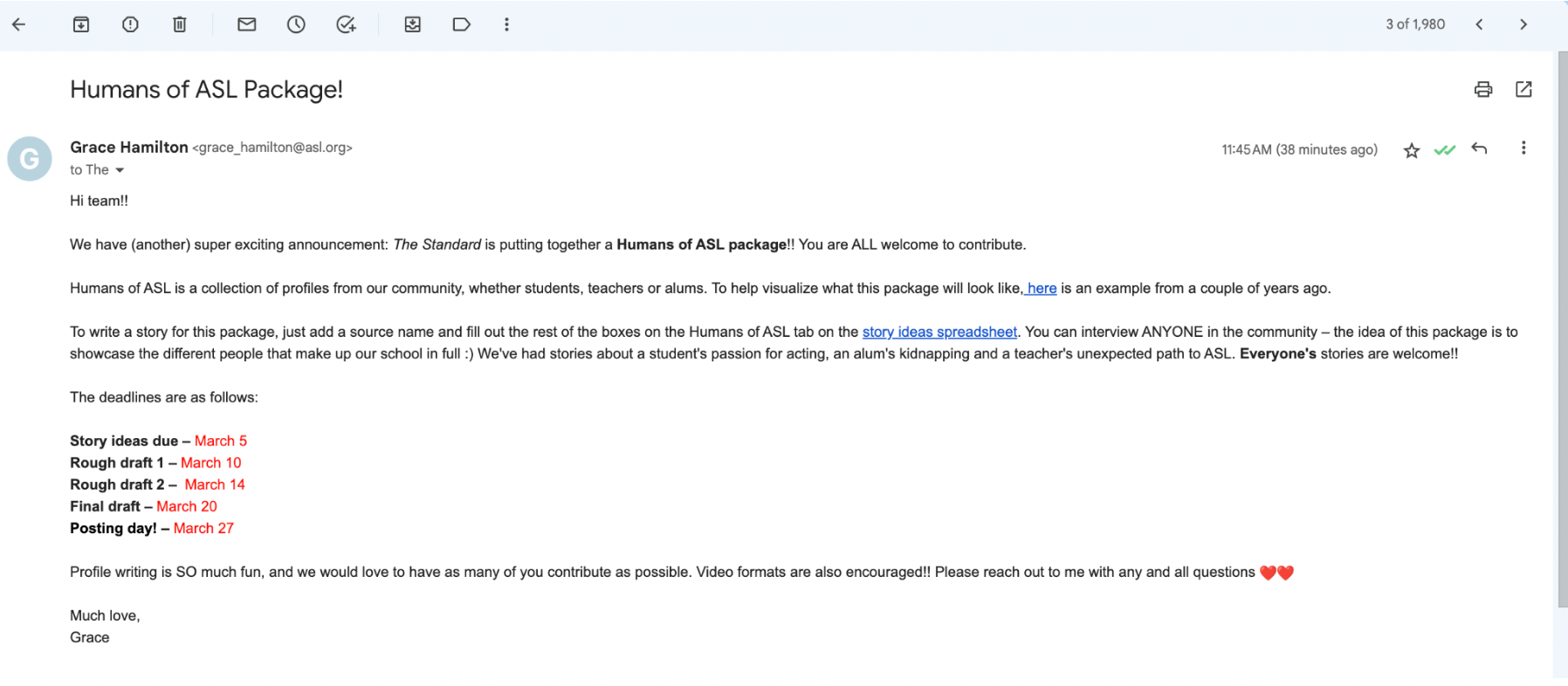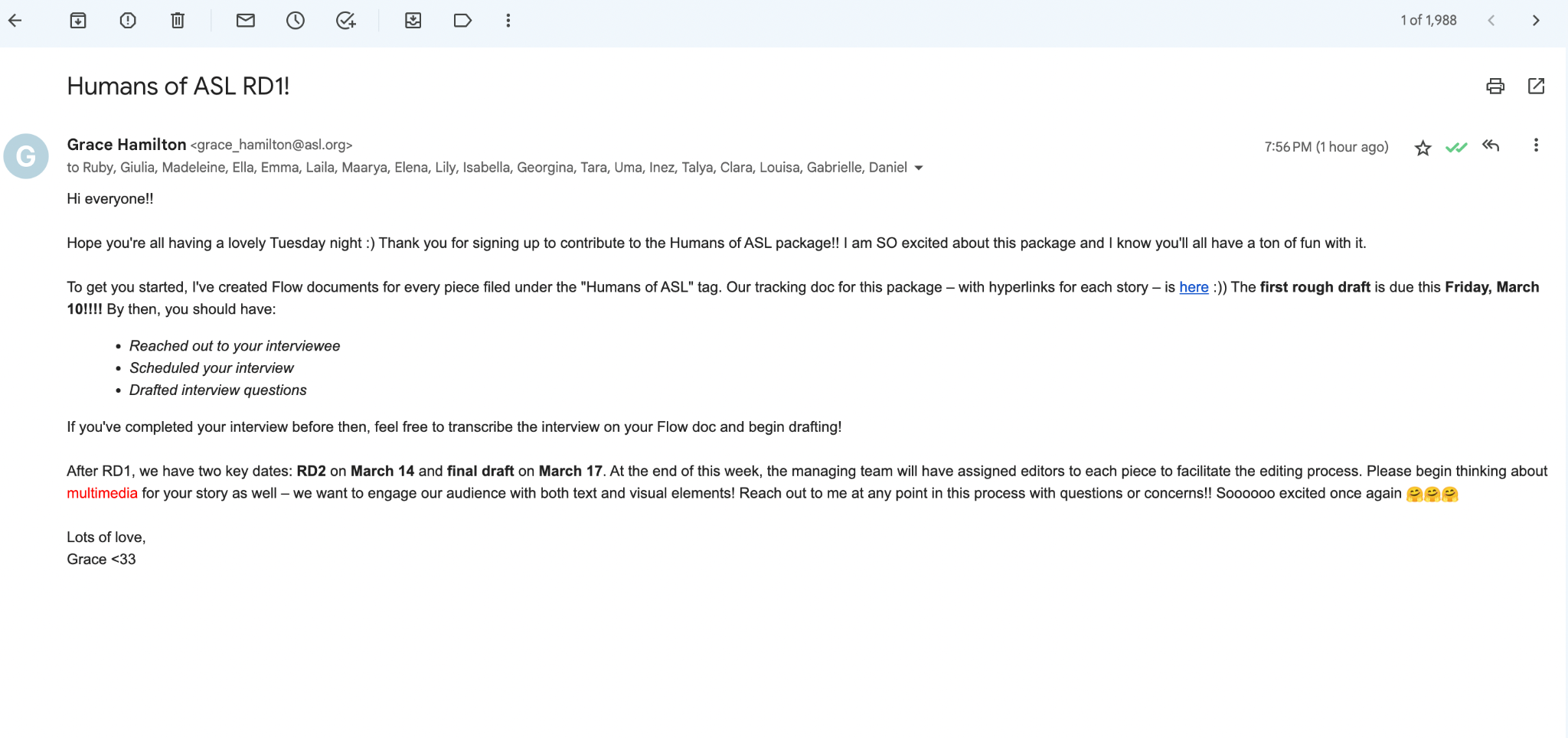 I also led the creation of a Humans of ASL package. Of course, reminder texts and staff emails were a key part of that process, too: