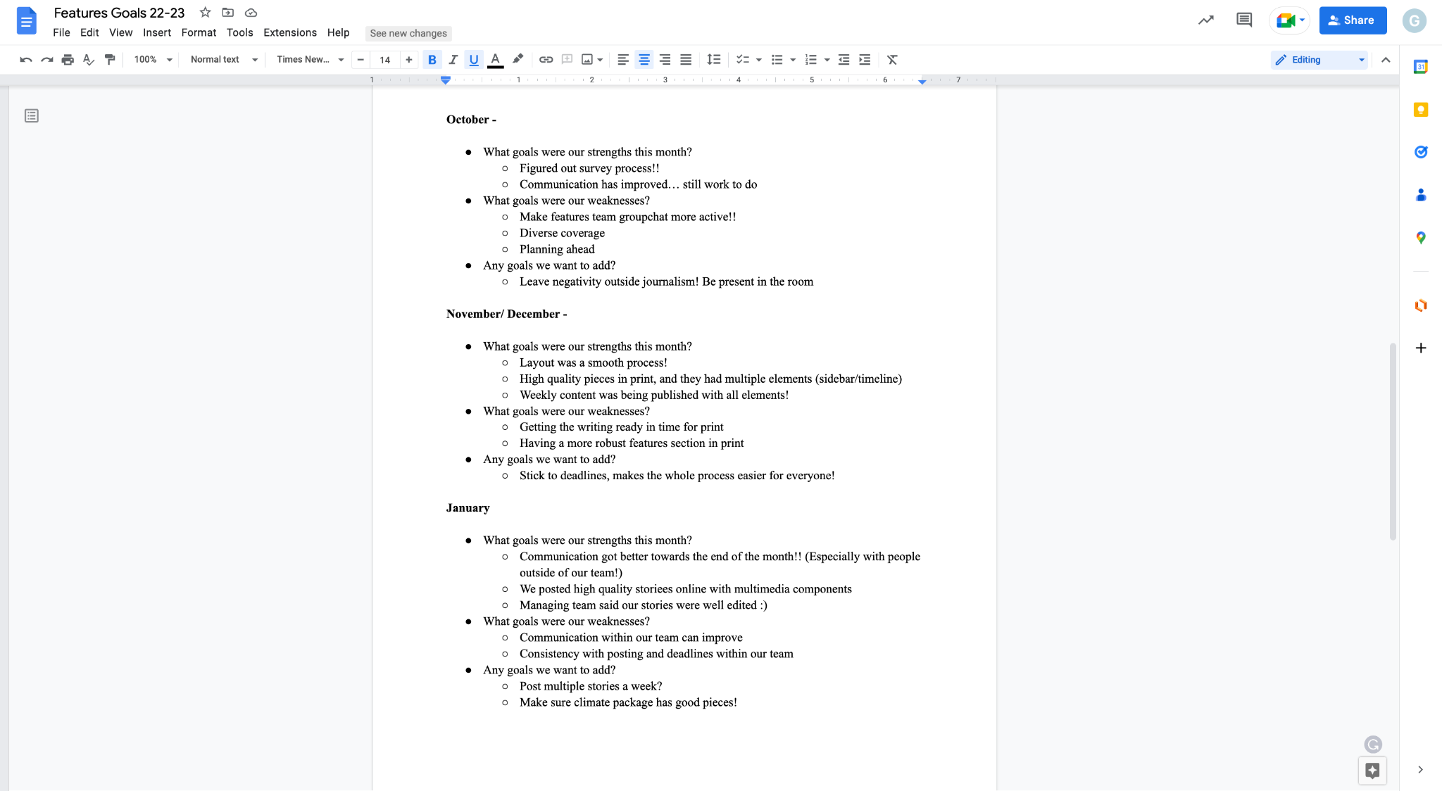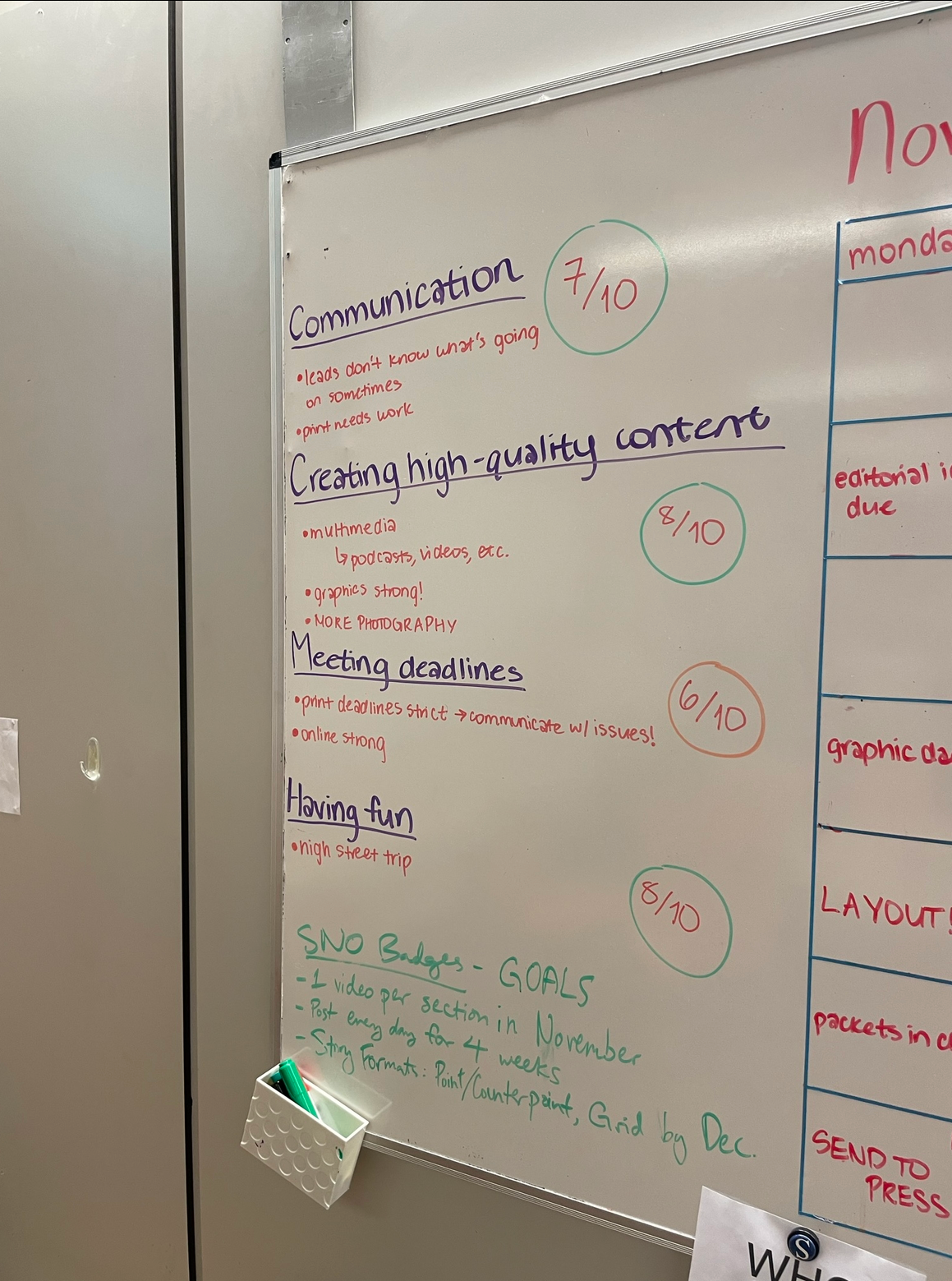 To organize sectional goals, I created a goal-setting document for each section that I dedicated class time for editors to reflect, revisit and set new areas for improvement. During sectional check-ins, we check back on those goals and give space for honest feedback.