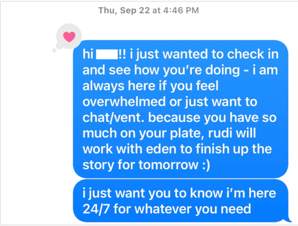 I constantly check up on my editors. I will often FaceTime editors or simply pull them out of the newsroom when stress is high so they can vent and take a breath. Earlier this year, an editor consistently failed to meet deadlines and was uncommunicative with her lead editor. I reached out letting her know that it’s okay to take a break and that the entire team is here to support. After having chats with both her and her section, she has massively improved in communicating when she is overwhelmed and needs extra help.