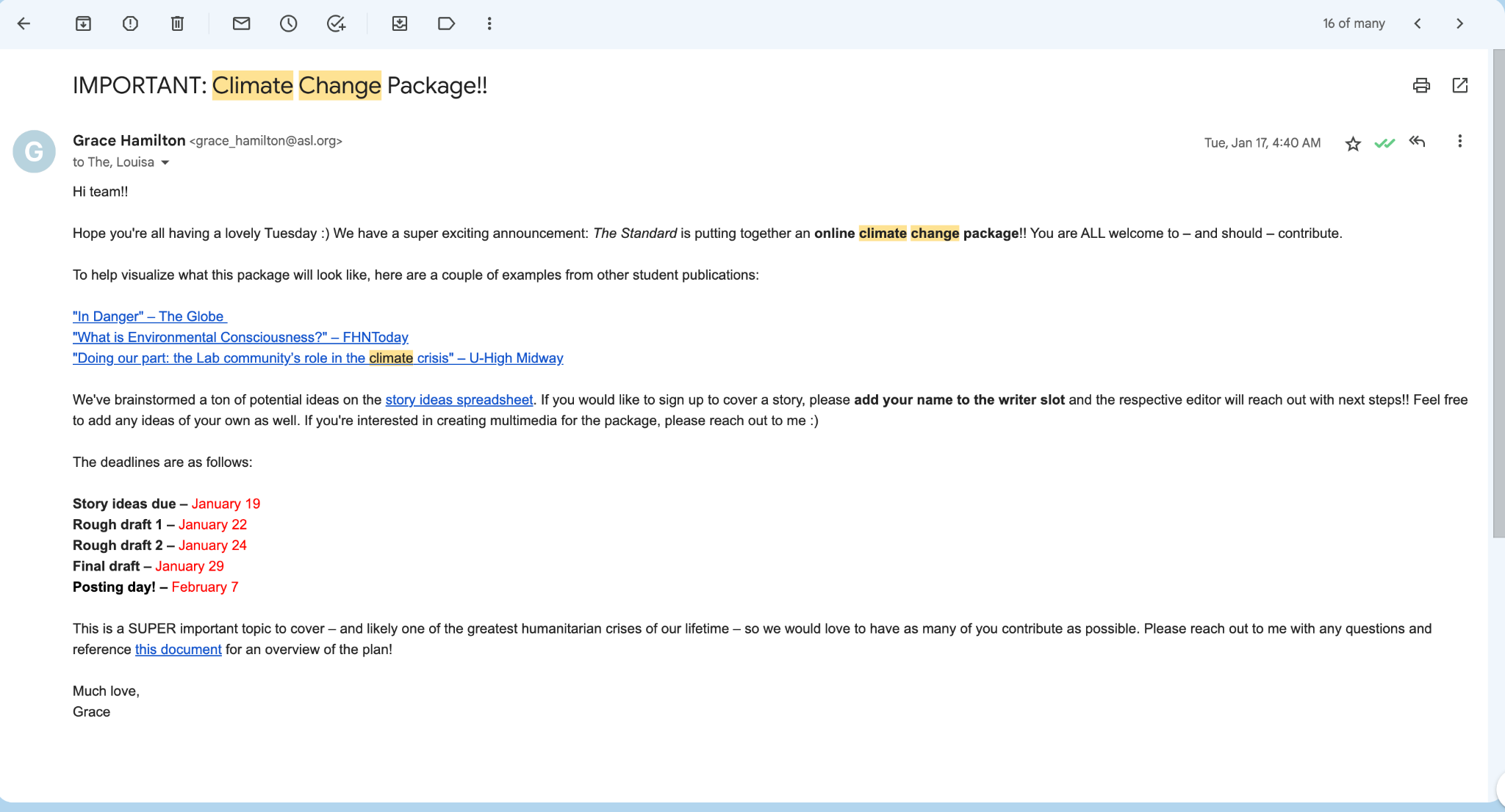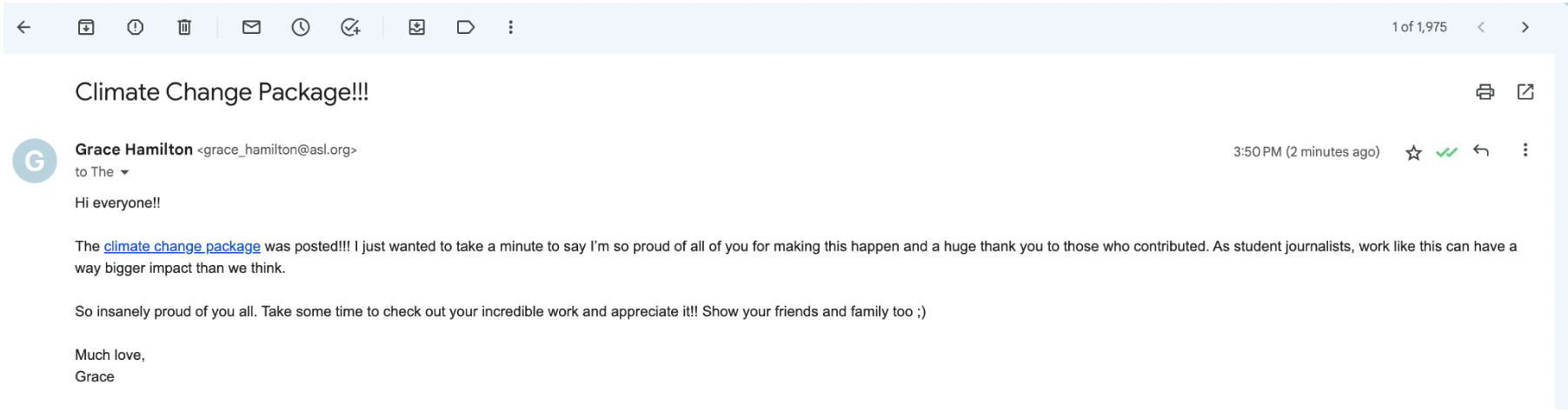 During my time as Editor-in-Chief, I have led the creation of two in-depth packages: "Confronting the climate crisis" and "Humans of ASL." Rallying the team around the creation of content that matters is so important to me as a leader in student journalism.
