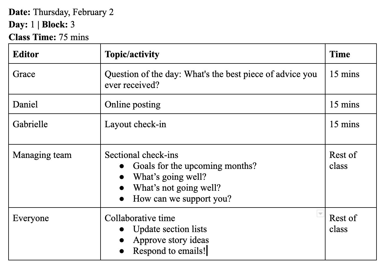 A key component of leading my editor's class is organization. Every night before class, I have a 15-minute meeting via Zoom with my Deputy Editor-in-Chiefs to plan. By meeting with the two of them, I can understand what they need from me, what the editors for both print and online require and what would be most useful for class time. We stick to this class structure, ensuring that we are productive and set out time for what the staff most requires.