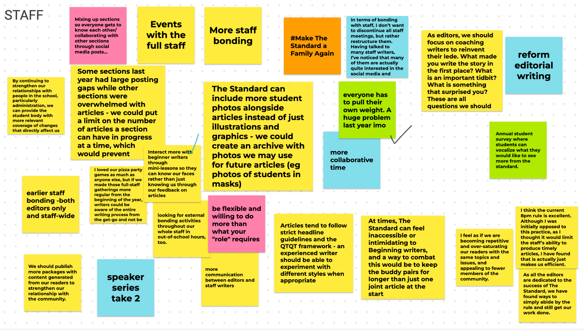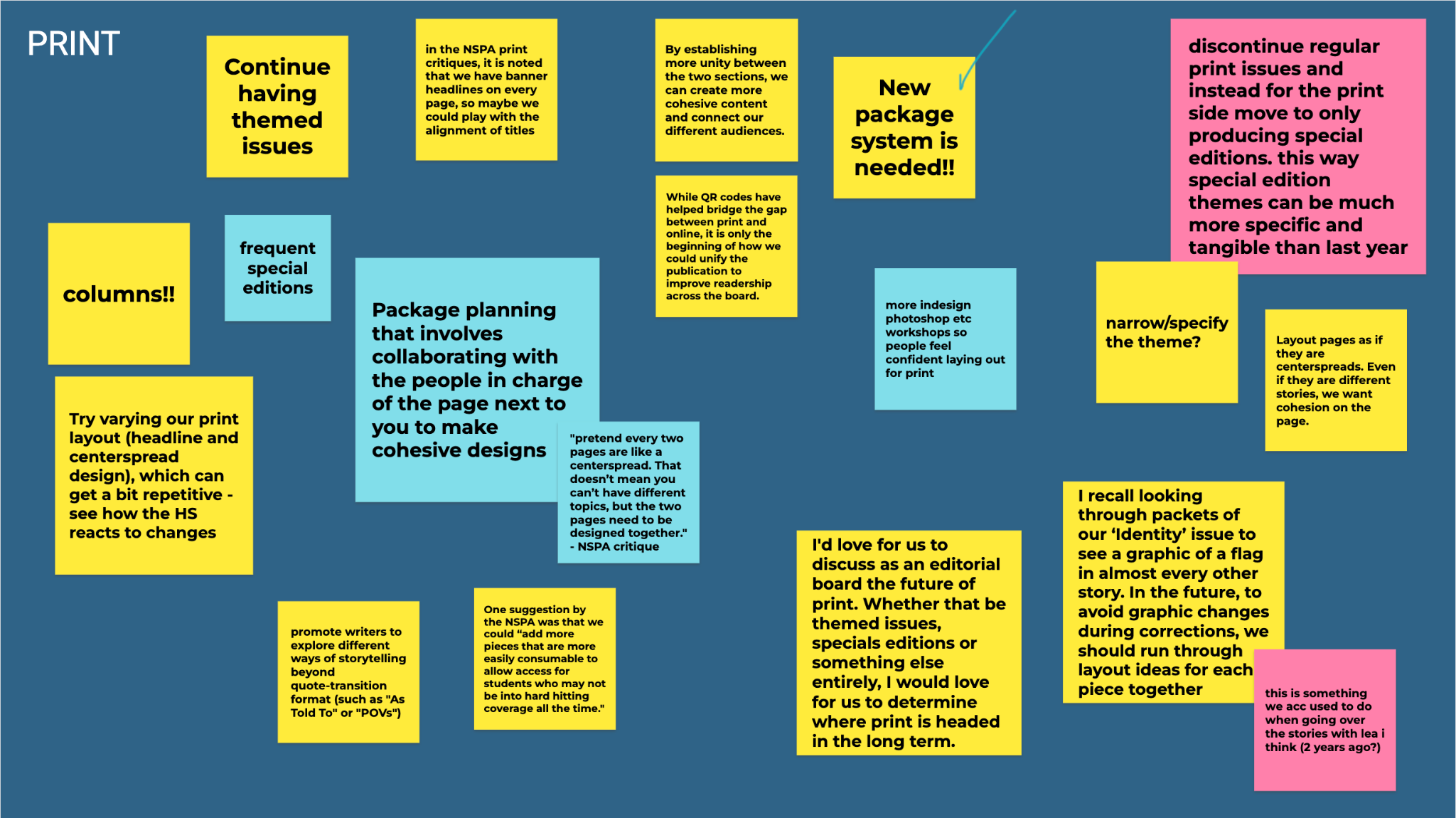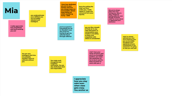 This year, I expanded reporter-editor collaboration through year-long mentors to further unity and the sharing of experience. Each reporter is paired with an editor, who meets up with them occasionally and is always available to answer questions. Providing a space in which younger team members seek guidance and support solidifies a cyclical, closed-circle journalism family.