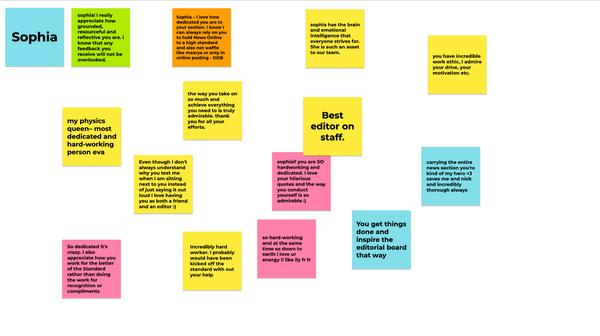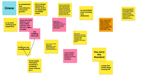 It goes without saying that Grace is an incredibly talented and hardworking journalist, but I think what truly sets her apart is her friendliness and willingness to help anyone in the room. She handles great responsibilities with an unparalleled professionalism that holds together The Standard staff, balancing the priorities of the publication with being understanding and empathetic.”
