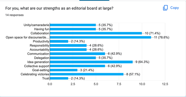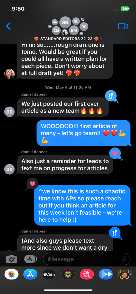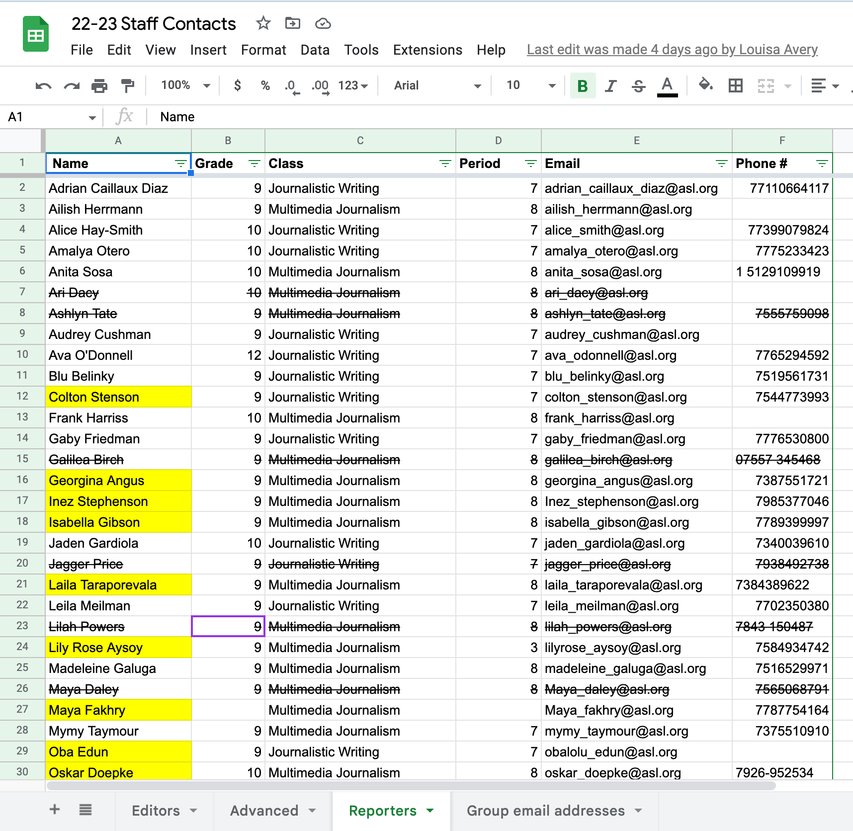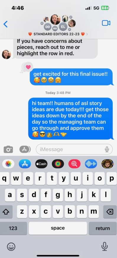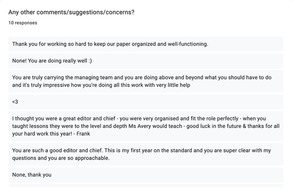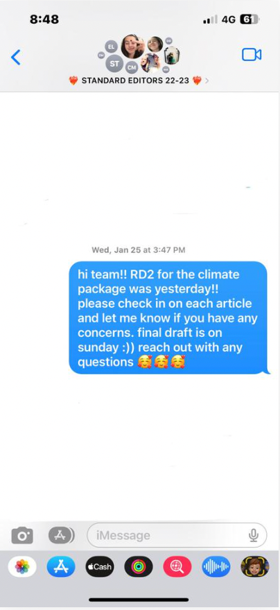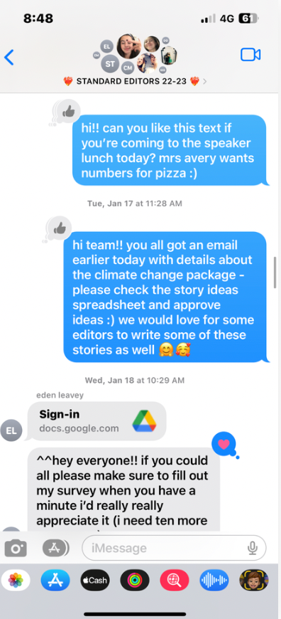 Aside from utilizing our digital platform for editing communication, I encourage direct contact through the staff contact spreadsheet. Editors are in contact with reporters at all times, available to answer questions and provide constant support.