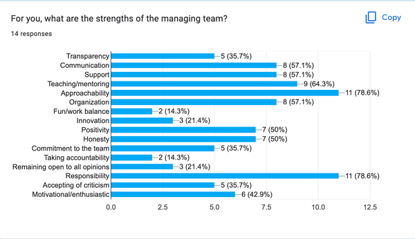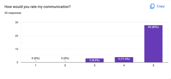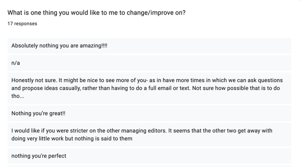 Beyond the team at large, I have also sent out a survey to all staff asking for feedback on my leadership. This type of anonymous, honest feedback allows me to pinpoint areas for my own improvement to further support my staff.