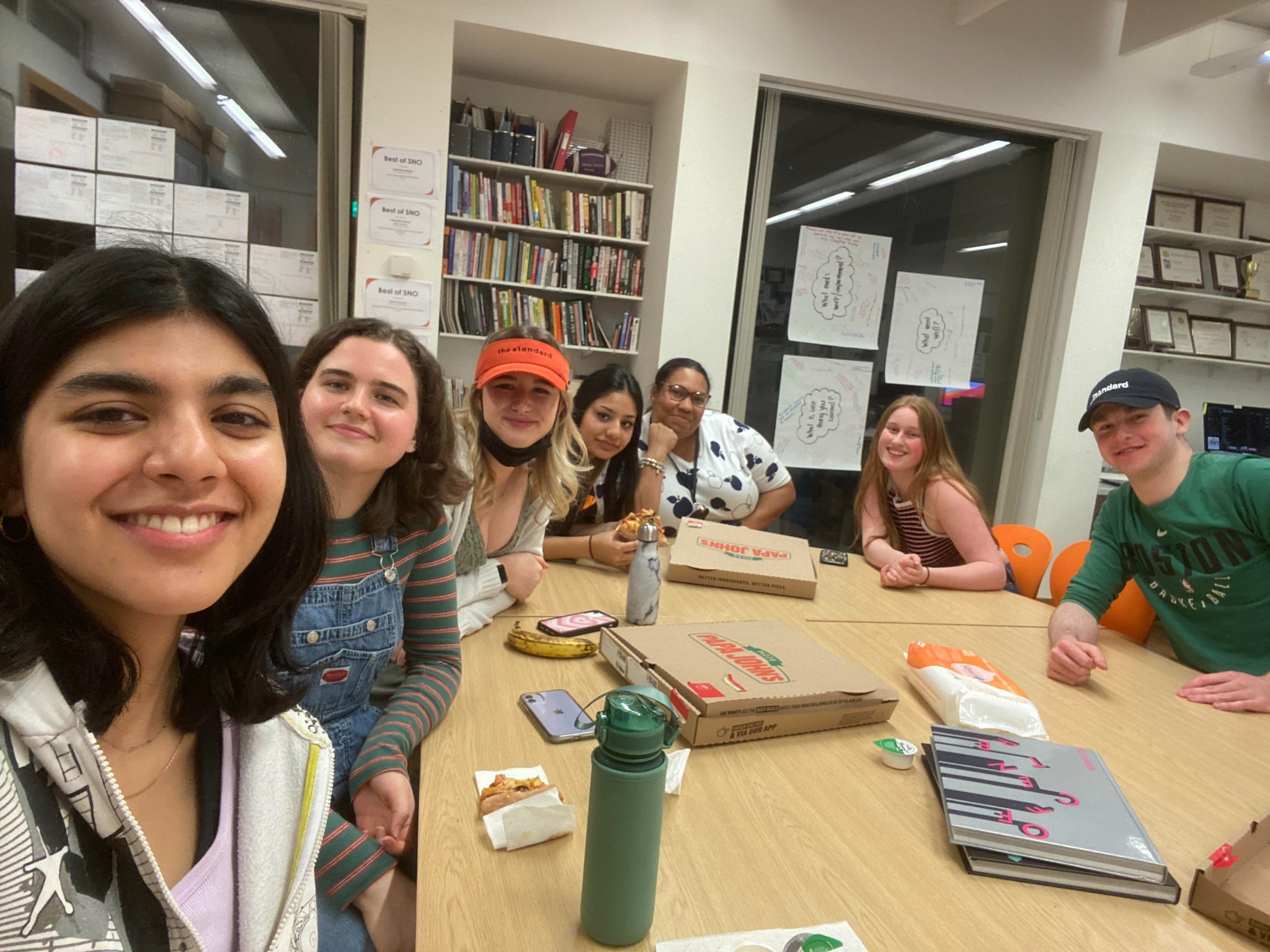 I organize staff lunches monthly, where all 63 members of the staff – across all four classes – gather to eat lunch together, check in with editors and have some fun. Earlier in the semester, we did a marshmallow house building activity and a game of "find five things in common." These lunches help make younger reporters feel as if they're truly a part of the team and give editors a concrete space to form meaningful connections with those they mentor.