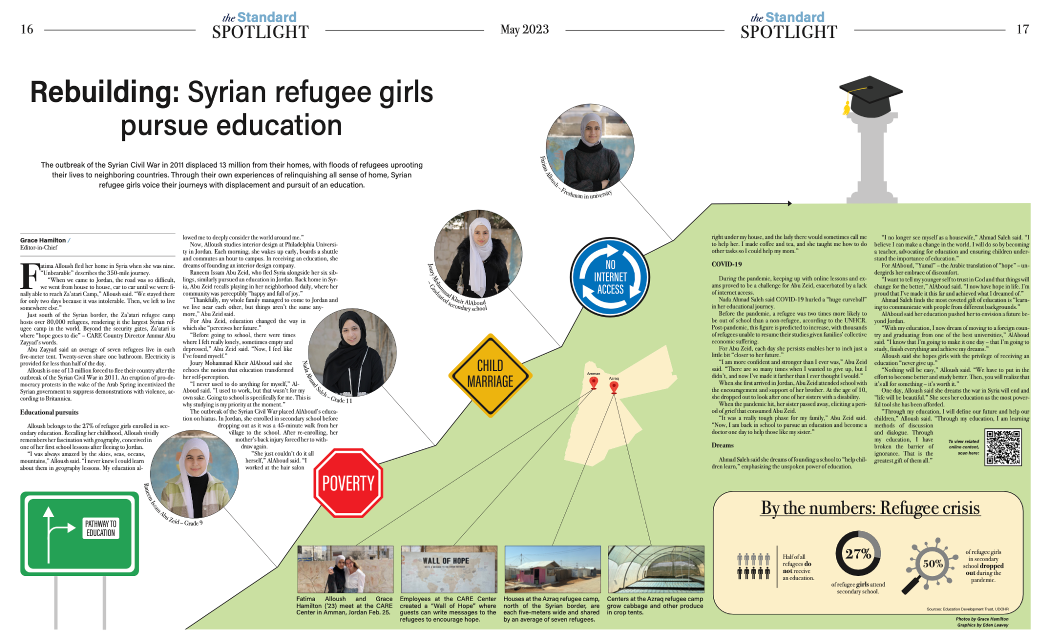 I wrote a piece sharing their experiences – with 10 forms of multimedia alongside it – for both print and online publication. The piece was our center spread "spotlight" in our fourth print issue. By writing this story, I hoped to raise awareness for refugee girls' education and bolster support in my community.