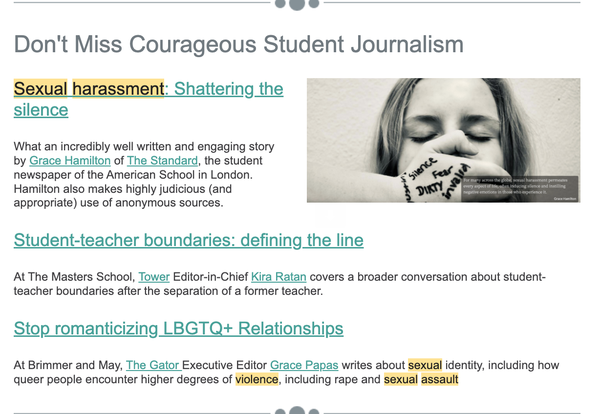 "Sexual harassment: Shattering the Silence" placed third in the 2021 NSPA Digital Story of the Year competition and received a Certificate of Merit for Newspaper Alternative Story Form in the 2022 CSPA Gold Circle awards.