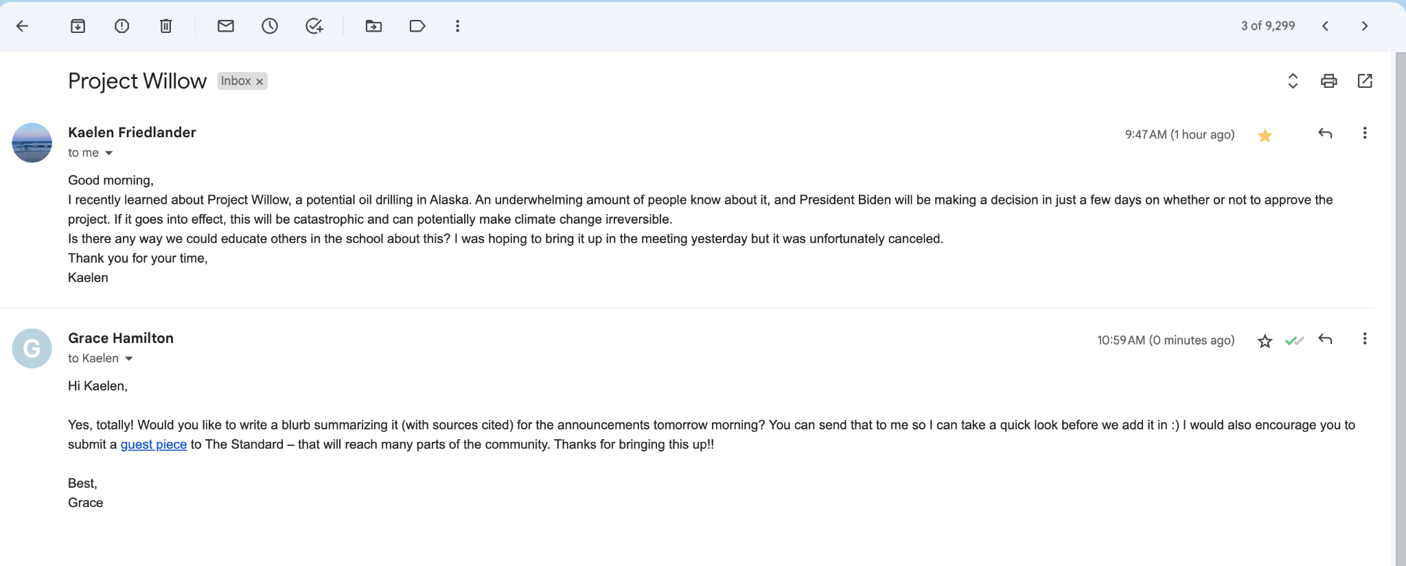 Among students, we frequently collaborate with the Student Council, the Sustainability Council and the Social Justice Council to ensure effective community involvement and integration. After posting an in-depth, online climate package, the Sustainability Council created a post promoting our content to the community, bolstering our readership: