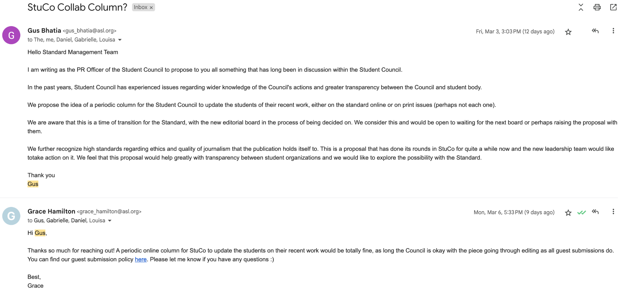 The PR Officer for the Student Council also reached out asking about a potential opportunity for a guest submission, and we are now working with the Council to help their vision for the piece come to fruition.