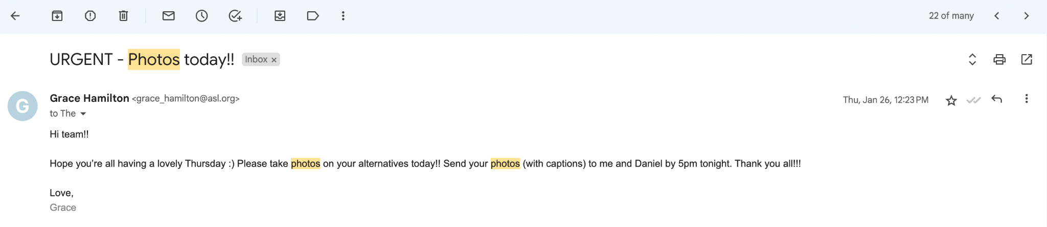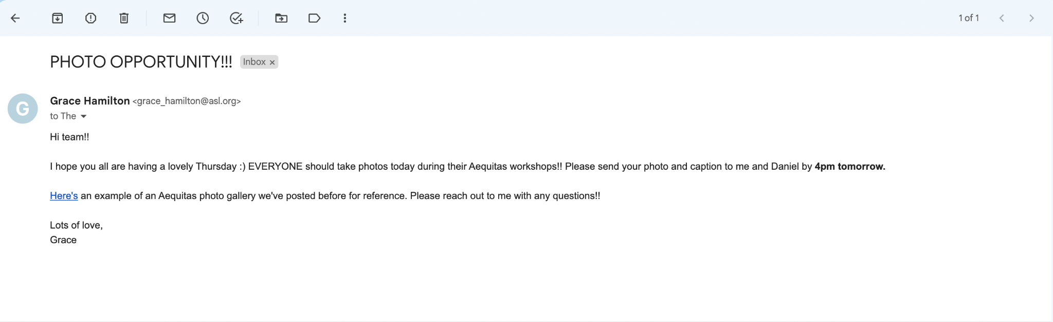 Aside from facilitating the event coverage spreadsheet to ensure members of staff take photos for each event, I send staff-wide emails for bigger events to encourage everyone participating to practice their photo-taking abilities and contribute to a photo gallery. Aequitas Week and alternative trips were two recent examples: