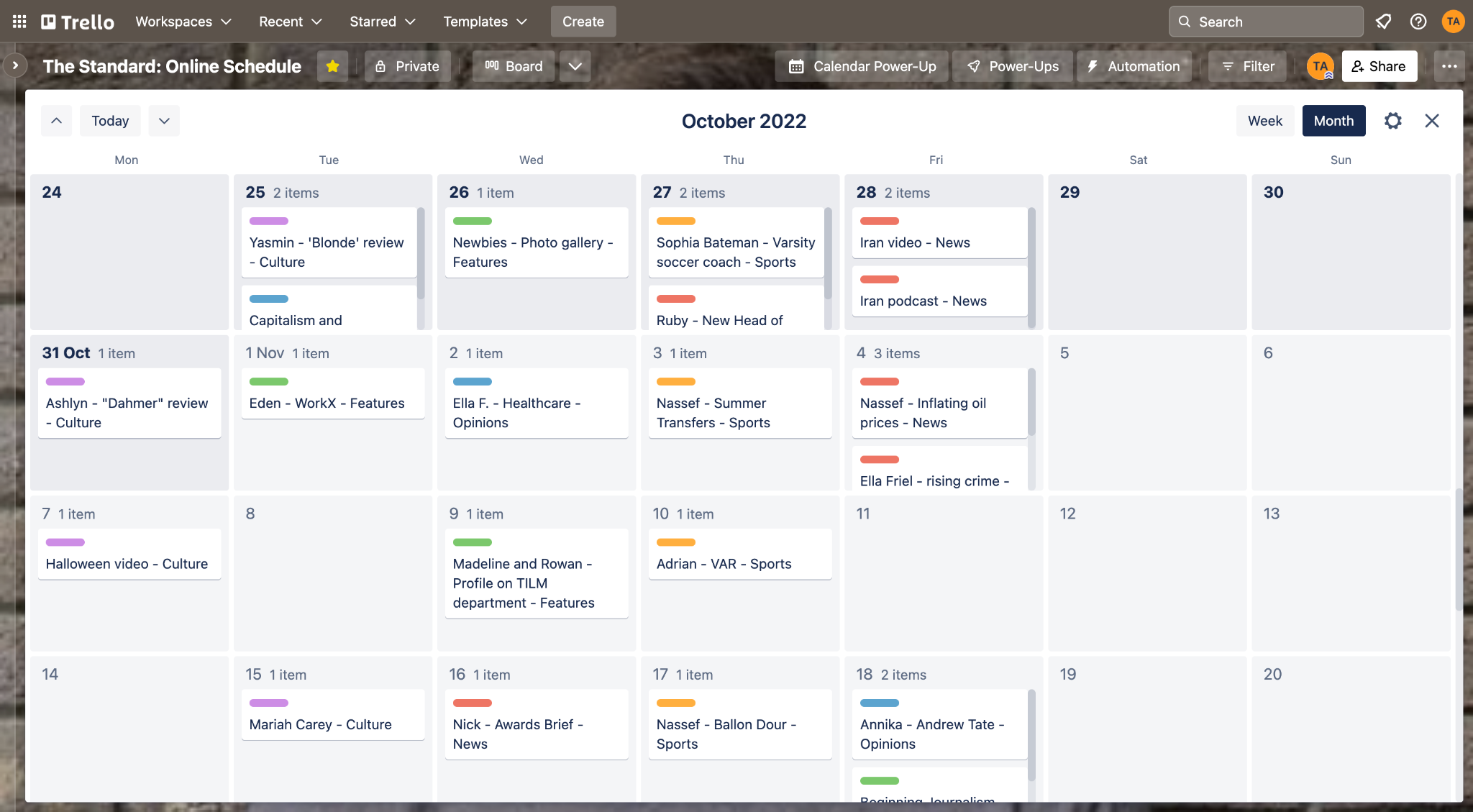To organize our daily posting each week, I walk through each story using the Trello program. Below is a screenshot of our online posting plan for the month of October. As Editor-in-Chief, I prioritize quality over quantity. Thus, each section is responsible for posting one day of the week: