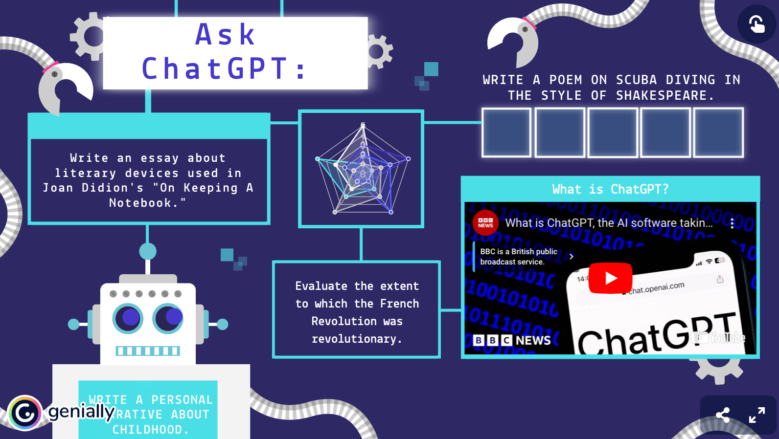 For an article I wrote on the emergence of ChatGPT in the community, I used Genially to create an interactive graphic with sample AI responses. Click the image to view the live graphic: