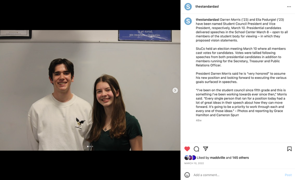 This year, I helped guide an expansion of our social media presence. I helped design posters across the school with QR codes advertising our social media and designated our Advanced Journalism class to be responsible for creating original posts that I edit before passing on to our Social Media Manager to post.