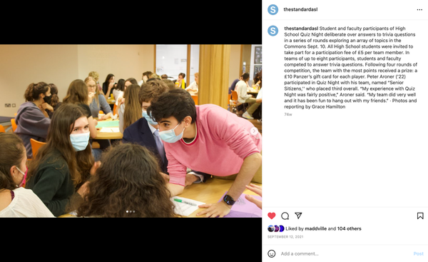 Now, we are significantly more consistent with daily Instagram posting. Each section has a designated post each week, with news covering school events, culture featuring a community artist, features profiling a mystery member of staff and sports covering recent games. For opinions, we post a weekly poll on our story.